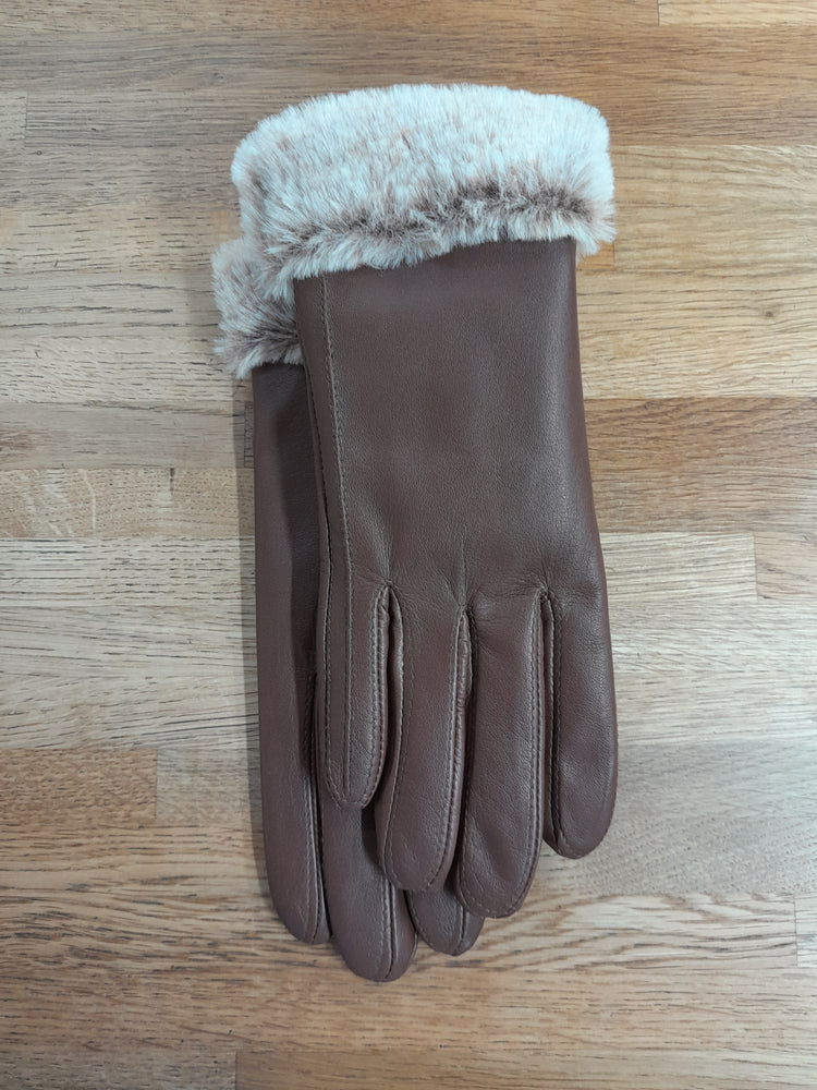 Ashwood ladies tan leather gloves with faux fur cuff.